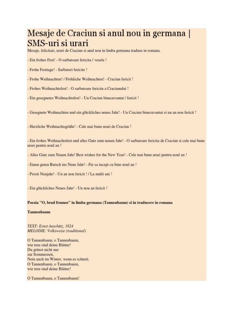 Substanțele germane încep întotdeauna cu o majusculă, spre deosebire de limba engleză, unde numai substantive sau substantive care încep o propoziție sunt capitalizate. In curand vine craciunul si trebuie sa le urezi craciun fericit celor dragi! Poezia o , brad frumos/tannenbaum/ o , christmas tree in germana si engleza. Verificați traducerile „crăciun fericit în germană. Dar surpriza nu va veni din inimile generoase care stau in transeele franceze, scotiene sau germane.