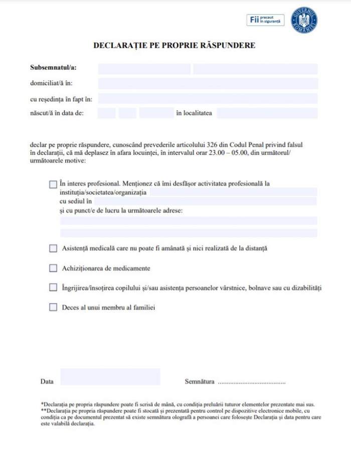 2 se scriu cu majuscule numele, iniţiala tatălui şi prenumele. Black friday bsb, oferta crematex pentru magazine de haine sh. Contribute to vtemian/declaratie development by creating an account on github. Declaraţia pe propria răspundere necesară pentru justificarea deplasării între localităţi poate fi scrisă şi de mână, cu respectarea elementelor din. Vom putea ieşi din localitate pentru participarea la evenimente familiale, cu un număr limitat de persoane şi cu respectarea regulilor de distanţare socială.