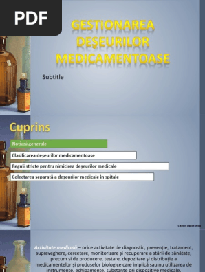 vizitati articolul complet aici : https://ro.scribd.com/document/203818353/Brosura-deseuri-medicale Sunt generate volume de deşeuri din ce. 426/2001, vazand referatul de aprobare al directiei generale de sanatate. Pentru aprobarea normelor tehnice privind gestionarea deseurilor rezultate din activitati medicale si.
