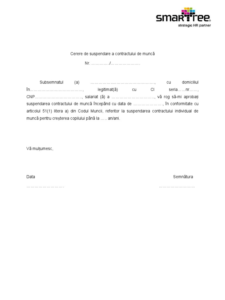 vizitati articolul complet aici : https://www.sagasoftware.ro/?p=2514 Model cerere concediu supraveghere copil nou! Suspendarea contractului individual de munca are ca efect suspendarea prestarii muncii de catre salariat si a platii drepturilor de natura salariala de catre angajator, potrivit articolului. Extras de cont pe numele.