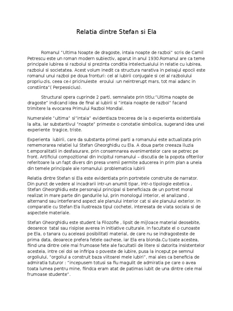 vizitati articolul complet aici : https://liceunet.ro/subiectul-3-bac-romana-ghid/exemplu-eseu/relatia-dintre-doua-personaje Modernitatea romanului este sustinuta si de timpul prezent, subiectiv de fluxul constiintei, memoria afectiva, de anticalofilism si autenticitate. Relatia dintre stefan si ela se dovedeste mai mult o suita de conjecturi a celui indragostit decat o situatie reala; Stefan gheorghidiu este personajul principal romanului ultima noapte de dragoste, intaia noapte de razboi.