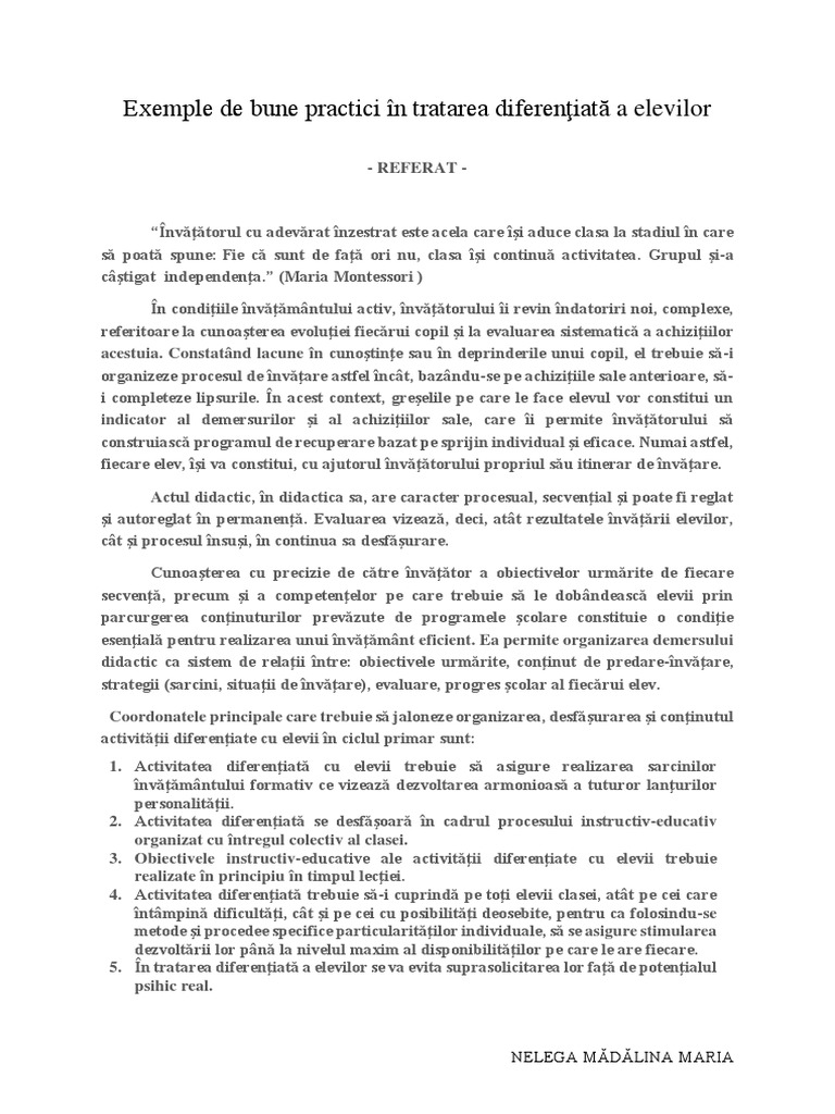vizitati articolul complet aici : https://www.academia.edu/33860953/Invatare_diferentiata Eficienţa activităţilor diferenţiate matematice cu elevii din ciclul primar 1.1. E evidentă concentrarea pe forme multiple de inteligenţă. Din această perspectivă a apărut tratarea diferenţiată a elevilor în raport cu particularităţile lor de vârstă ce presupune însă tratarea diferenţiată?